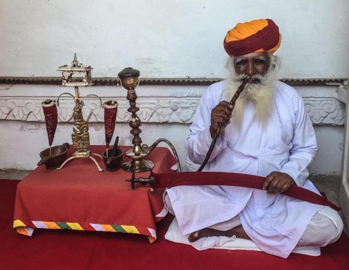 With only one full day in Jodhpur, which was plenty of time, we made our way to the Mehrangarh fort first thing in the morning. Having caught up with my university friend Hattie, I was beginning to feel a lot more at ease with travelling India as a female. Mehrangarh is a majestic fort that casts a shadow over the old blue city. Having loved Jaipur’s Amer fort which had a spectacular landscape, Jodhpur’s fort boasted a beautiful interior. Feeling like a true tourist with our audio guides, we weaved through the complex halls of the fort which also act as a museum. As we climbed up what was called the ‘hill of birds’, it epitomised it’s name; hundreds of pigeons made their home in the walls of the fort. It was a beautiful edition watching flocks burst across the top of the fort structure. It’s like something from a movie. At the entrance to the fort you can find sets of terracotta handprints laid into the walls. When the first Maharaja of Jodhpur died, his many wives volunteered to be part of the Hindu ritual named Sati, in which the recently widowed women give themselves as a sacrifice on their husbands funeral pyre. Before the women were burned alive with their dead husband, their handprints were embossed into the walls as a remembrance. Something eerie and hard to contemplate. We began strolling through halls full of opulent elephant howdah’s (elephant seats), palace of palanquins (seats carried by people), traditional artwork and rooms laden with mosaic mirrors and gold. In courtyards, turban clad men showed us the hookah pipes in which the Rajpats smoke their opium, “it makes them strong”.